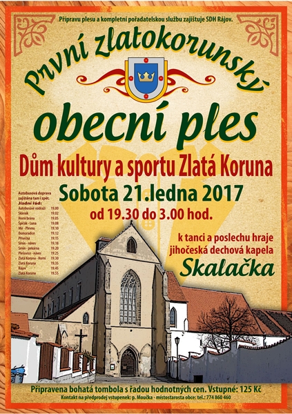 Autobusová doprava zajištěna. Předprodej vstupenek je možný na obecním úřadě ve Zlaté Koruně Tel 380743119 nebo e-mail ou@zlatakoruna.cz. Součástí plesu bude i bohatá tombola s řadou hodnotných cen. V této souvislosti žádáme všechny případné dárce, kteří chtějí doplnit a rozšířit tak tuto tombolu, aby předměty dopravili v úředních dnech a hodinách na obecní úřad Zlatá Koruna nebo předali předměty v pátek 20.ledna od 18.00 hodin v Rájově v restauraci Na Kovárně.