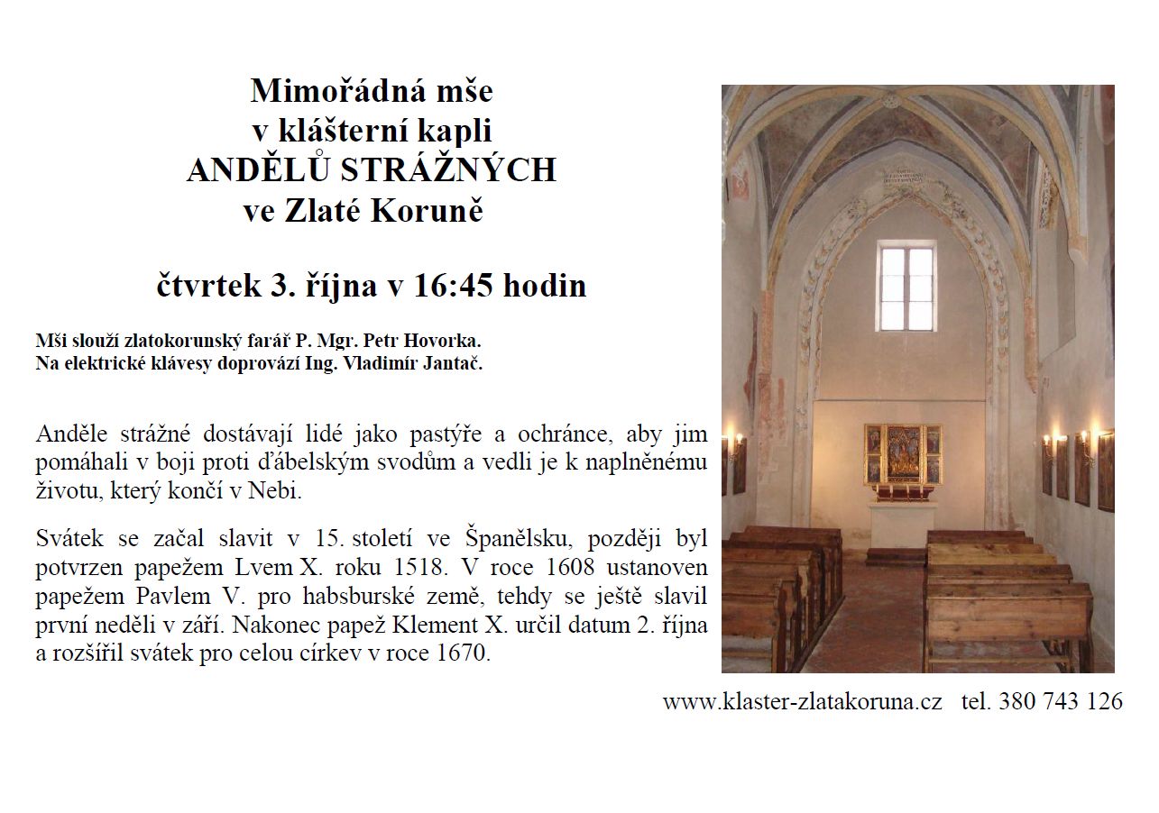 Mše k svátku Andělů strážných, vstup zdarma. Mši slouží P. Mgr. Petr Hovorka, na elektrické klávesy doprovází Ing. Vladimír Jantač.