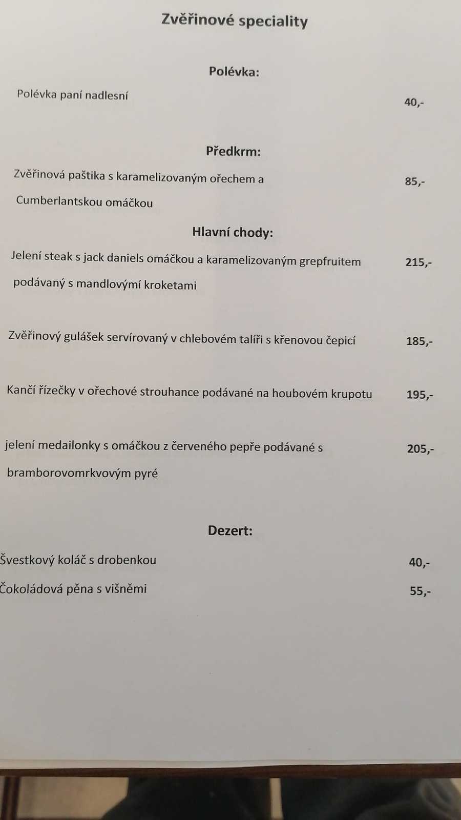 Dršťková polévka, vepřové maso na houbách s rýží, ořechovo-medový řez.