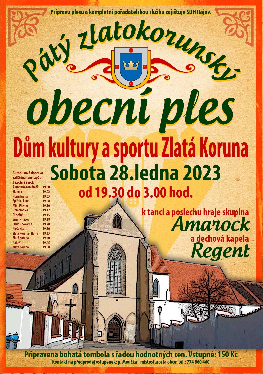 Připravena bohatá tombola s řadou hodnotných cen. Kontakt na předprodej vstupenek: Radek Moučka – místostarosta obce tel. 774 860 460. Autobusová doprava zajištěna tam i zpět (jízdní řád naleznete na přiloženém plakátu).