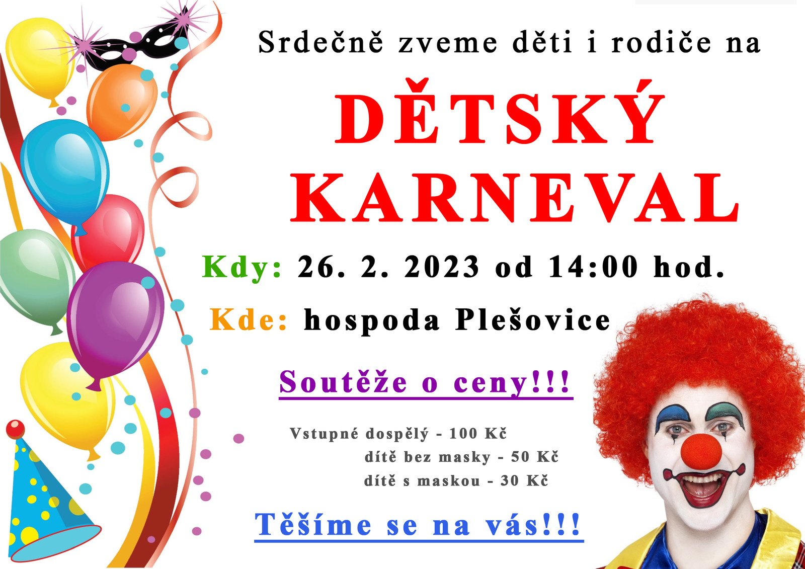 Sraz masek v 9 hodin na návsi u kapličky. Následně, se svolením pana starosty, vyrazí průvod masek na koledu. Po obchůzce obcí bude volně pokračovat masopustní zábava v plešovické hospodě. Proběhne soutěž o nejhezčí a nejvtipnější masku. Součástí bude i tradiční zabijačka. Prosíme o přijetí a malé občerstvení pro koledníky ve vašich domovech. Děkujeme a budeme se těšit. Pořádá SDH Plešovice.