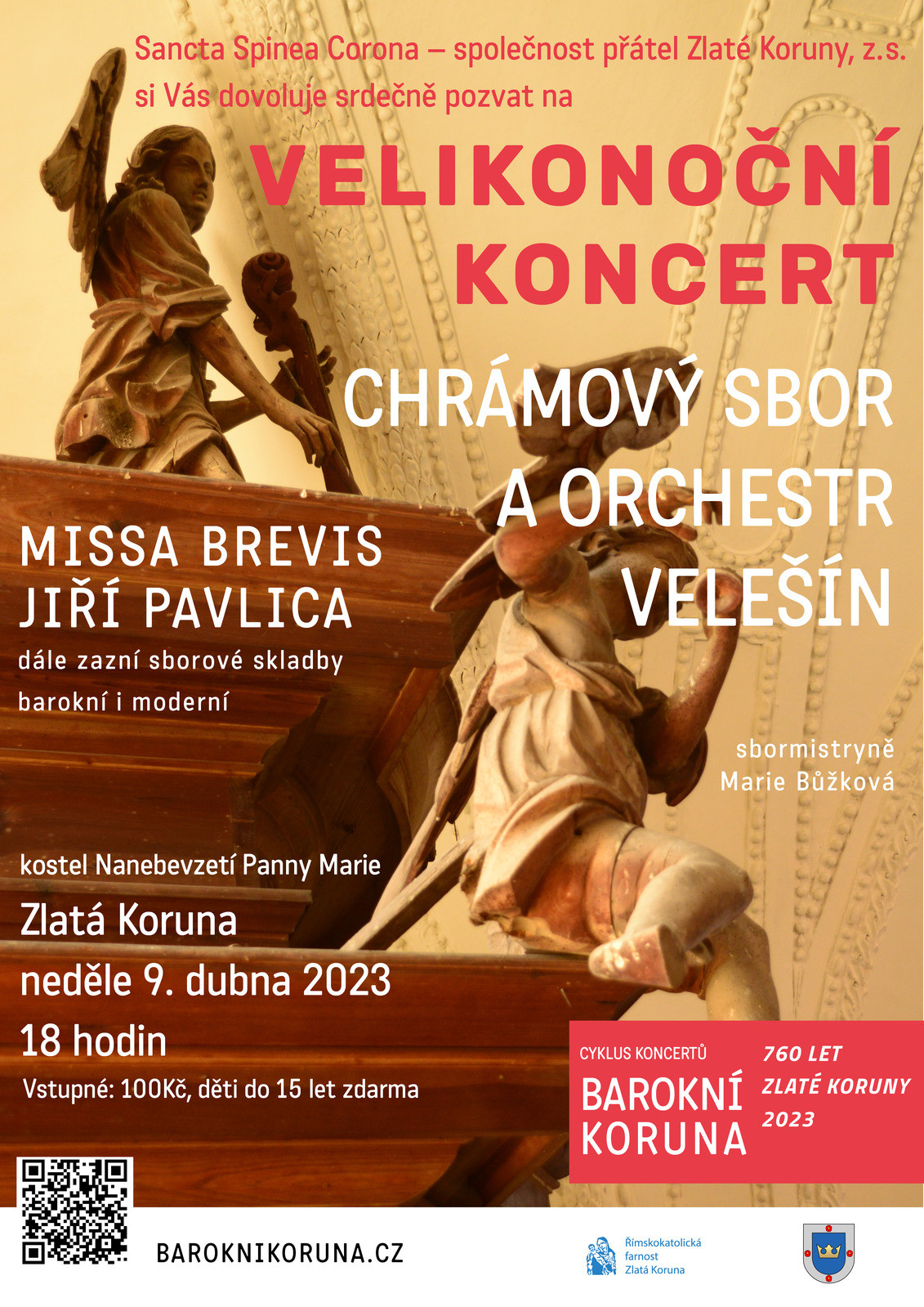 Společnost přátel Zlaté Koruny si Vás dovoluje srdečně pozvat na Velikonoční koncert v podání Velešínského chrámového sboru a orchestru pod taktovkou Marie Brůžkové. Zazní již tradičně Pavlicova Missa brevis. Dále zazní sborové skladby barokní i moderní. Vstupné 100 Kč, děti do 15 let zdarma.